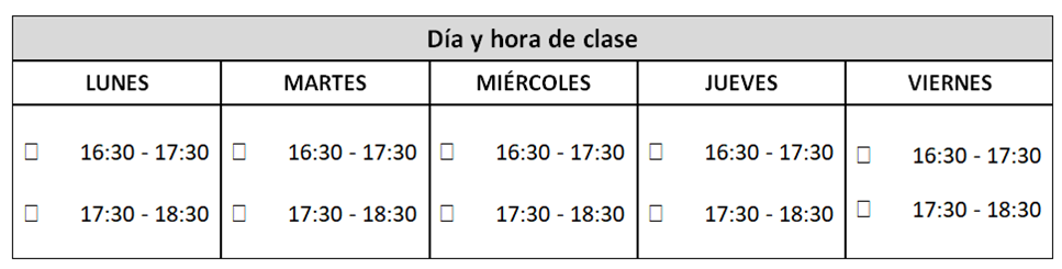Días y horas en los que se imparten las Escuelas Infantiles. Se pueden matricular el número de horas que quiera, con un máximo de tres horas a la semana. Cada día y hora supone una matrícula diferenciada.